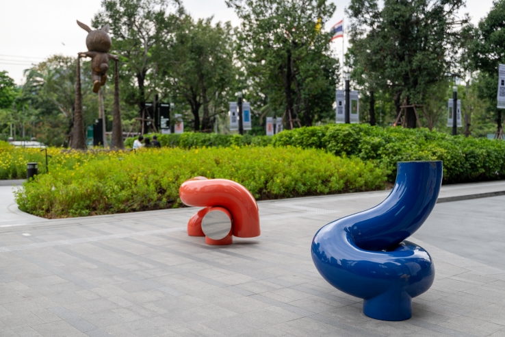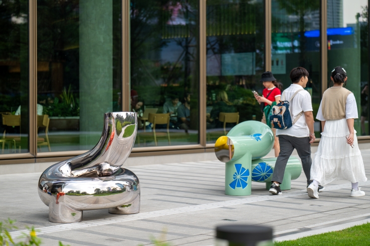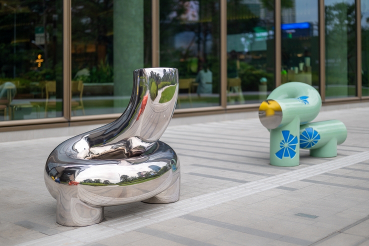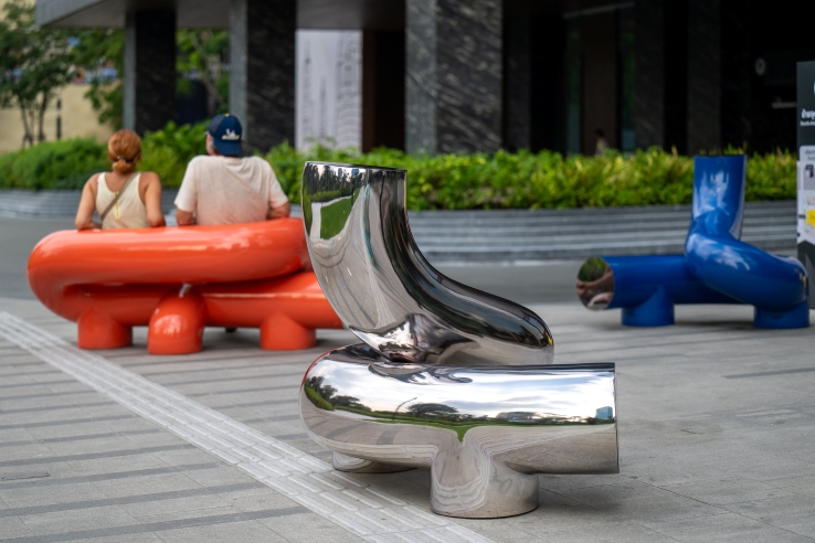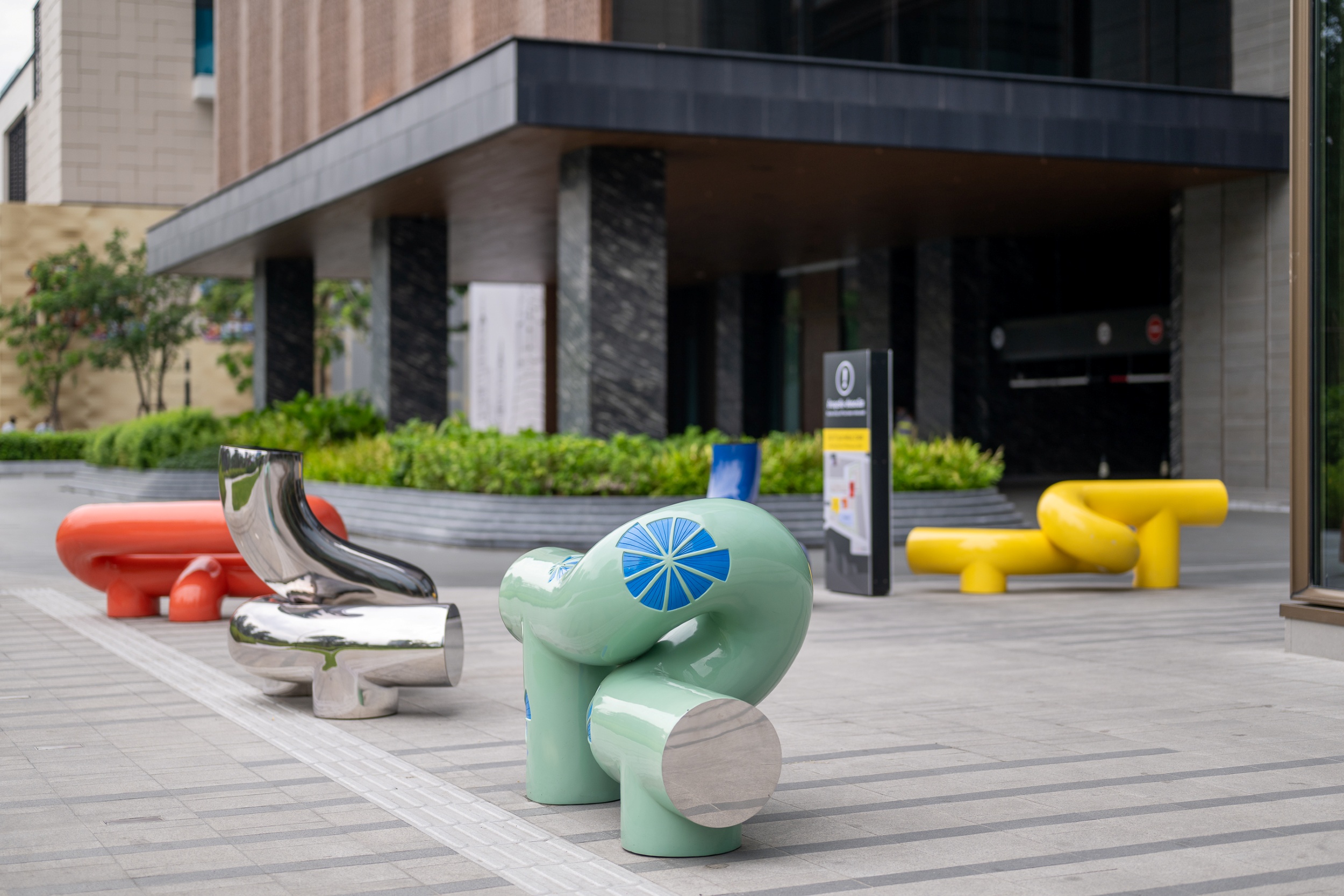 Structurally, B3X strikes a balance between sculpture-like aesthetic and durability. With an aluminium frame and a skin of fiberglass and chromium, it is lightweight yet strong, well suited for a high-traffic public area. Installed at the drop-off area in front of The Storeys, each leaning post has a different form and texture, allowing users to choose “the right space” for themselves. Representing a reinterpretation of memories and the journeys of urban dwellers, B3X stands as an example of how user-centric design can help turn a public area into a space for everyday experiences and stories.
