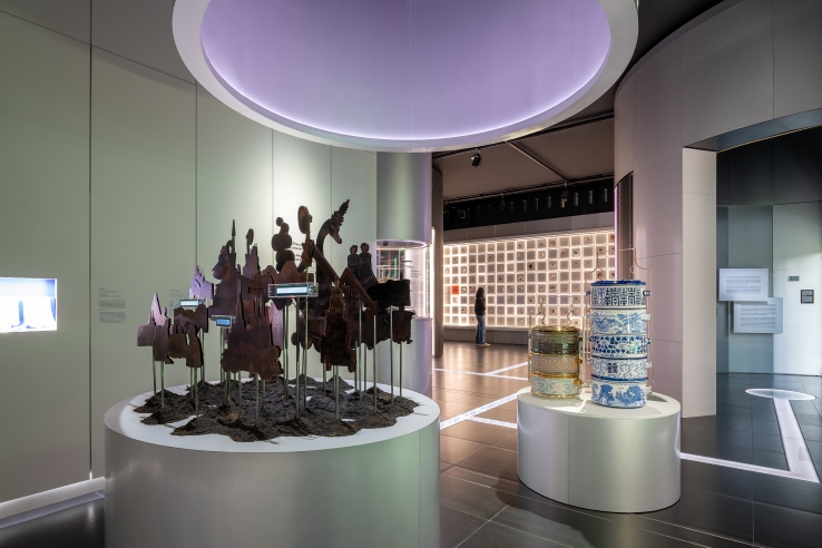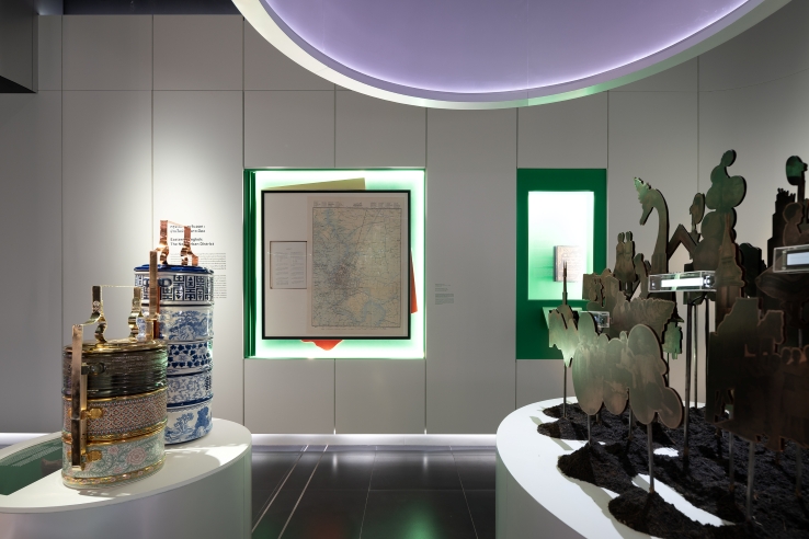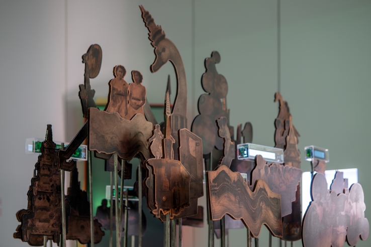 His mixed-media work Greetings of Times is a three-dimensional collage of copper plates, a material the artist chose due to its importance in radiotelegraph communication. Historical images of events that took place in the Wireless-Rama IV neighbourhood, including the Siamese Kingdom Expo of 1925, activities in Lumpini Park, and lifestyles of people in the early modern era, are recomposed to create a round relief that can be viewed from any angle. Each copper plate is attached to a metal pole extending from a base of soil, making it appear as if images from the past are rising from the earth—a reminder to viewers of the layers of memories that lie buried in this space.