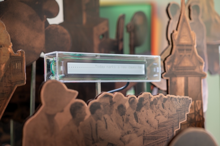 Interspersed with the copper plates are LCD screens flashing the 17-word text of the first radiotelegraph message ever sent in Thailand, although here it is recomposed by artificial intelligence into constantly changing free verses. These exchanges across time constitute a reawakening of the stories that lay dormant beneath the ground of Wireless House One Bangkok, a memorial to Thailand’s first radiotelegraph station.