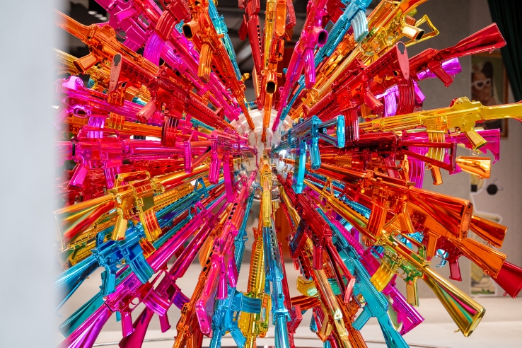 Inspired by the vibrancy of markets and junk shops, his works in the Happy Happy Project tend to be large-scale installations using everyday and recycled objects, usually plastic or colourful items familiar in daily life. An important piece in the series, Happy Happy Project: Flower Gun looks from a distance like a blooming flower but is in fact made up of 98 plastic toy guns. Playful and fun on the surface but menacing on closer examination, it is a metaphor for the paradoxical world of superficial happiness we live in. Plastic guns, a symbol of violence, are transformed into an alluring object loaded with colour and irony.