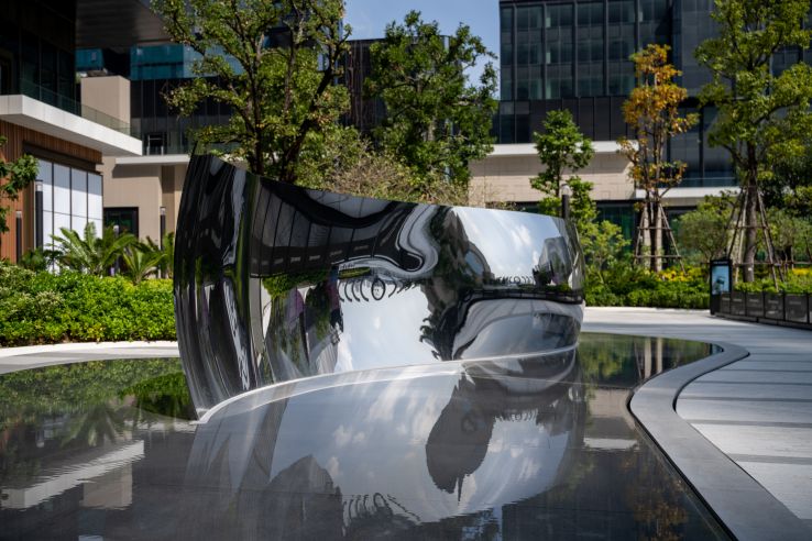 S-Curve, crafted from two seamlessly joined pieces of mirror-polished stainless steel constituting a reverse-S shape, has convex and concave surfaces that decrease, enlarge and distort images of its surroundings. Creating optical illusions that twist and turn unexpectedly, the sculpture seems to have a life of its own, revealing a new world where humans, environment and architecture collide and entwine in beautiful and vertiginous unison. This work of optical wizardry conjures up a parallel world. When viewed from the edge, however, the reality of objects and the sculpture’s meandering curves become evident, like a sublime exposure of a myth.