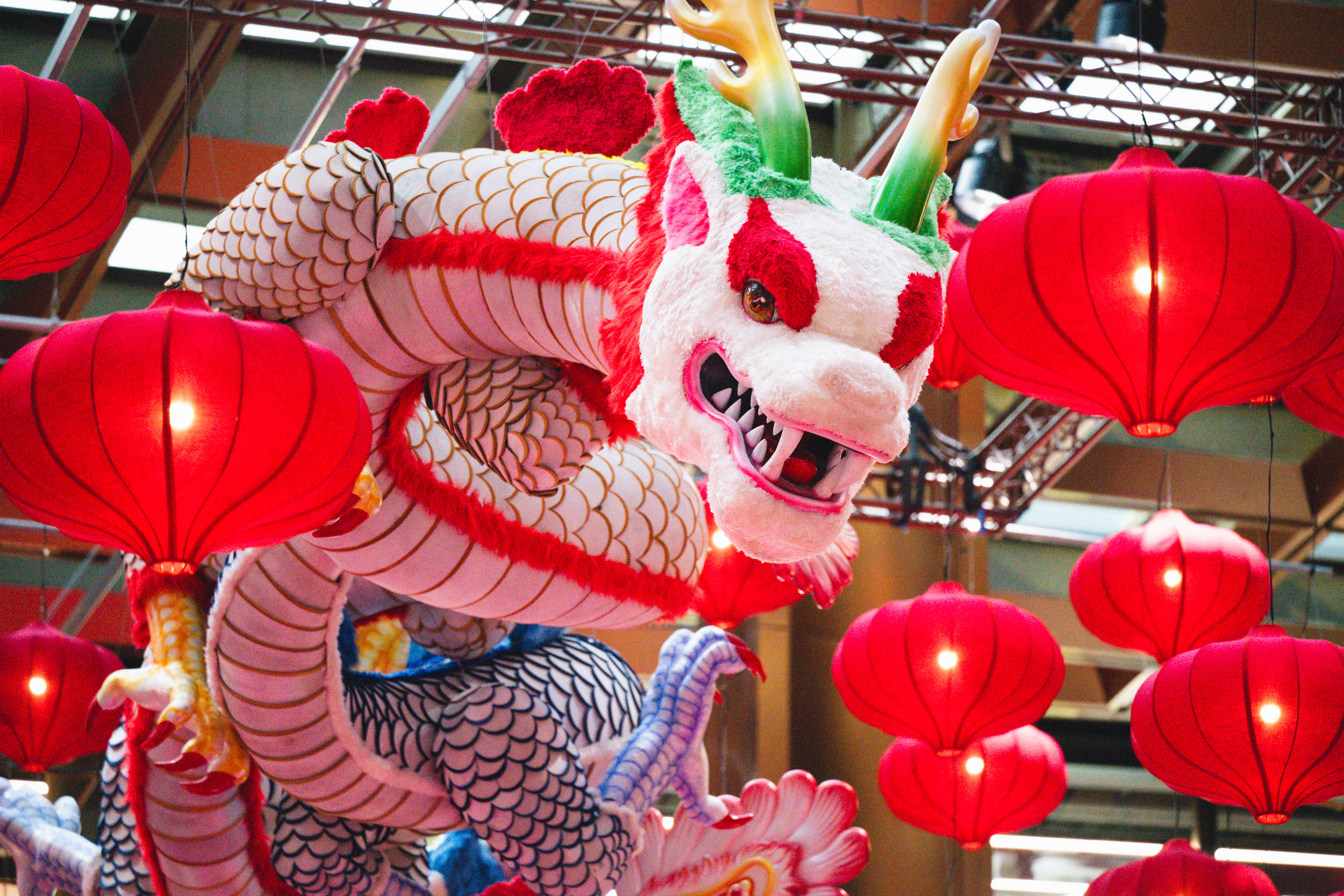 Endless Blessing Dragons: Admire the sculpture of twin dragons entwined to form the auspicious figure "8," a symbol of immortality and infinite wealth, framed by hundreds of radiant red lanterns at The Storeys Square.