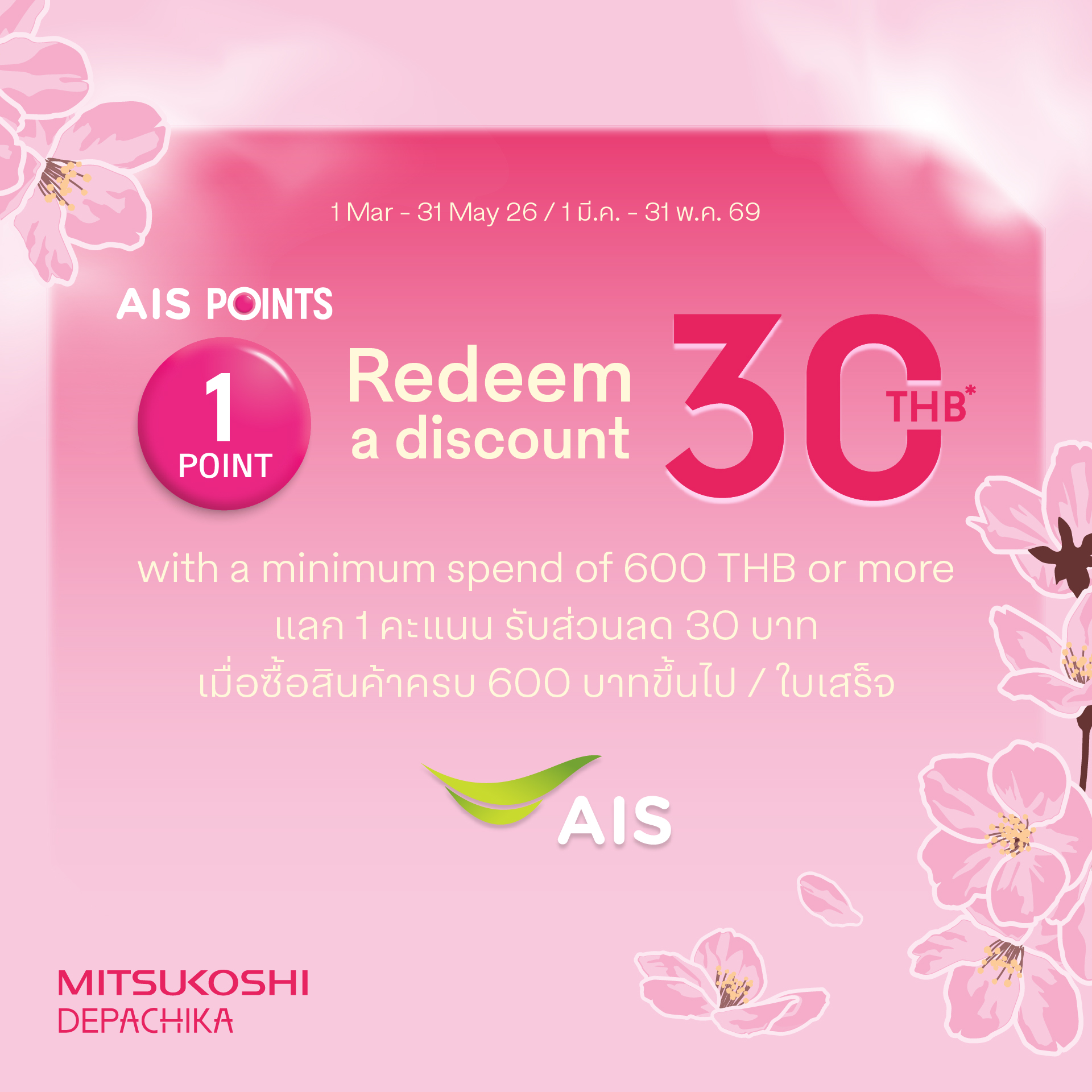 - AIS customers can redeem 1 point to receive a 30 THB discount when spending 600 THB or more per receipt.