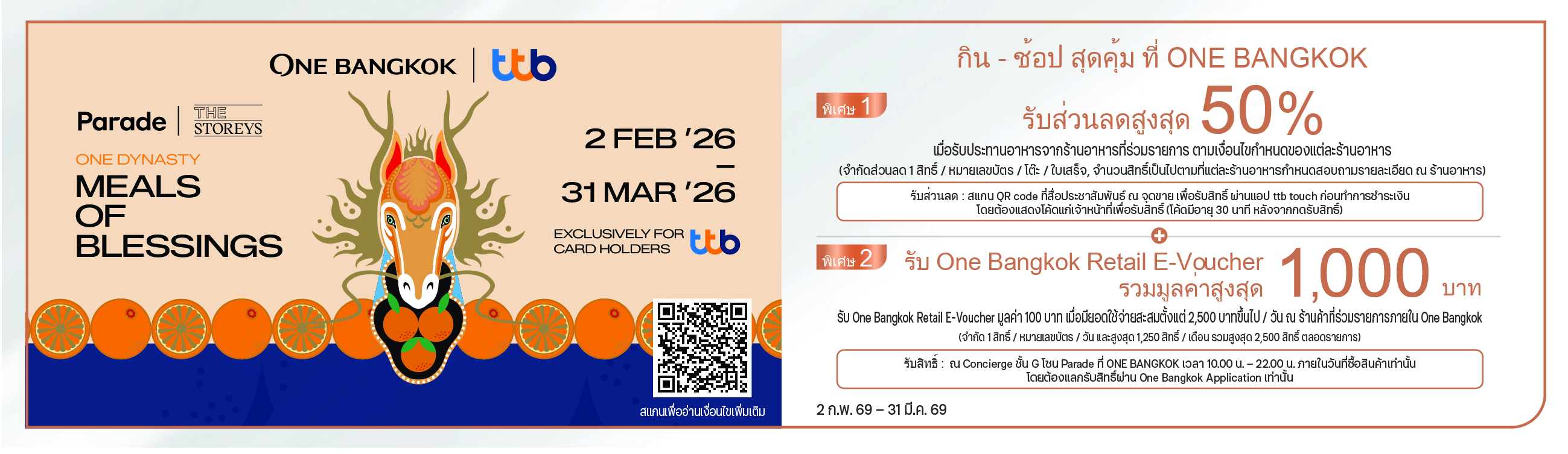 For the list of participating merchants, please click: https://media.ttbbank.com/1/promotion/credit-card/feb26/shopping-onebangkok-feb26.pdf