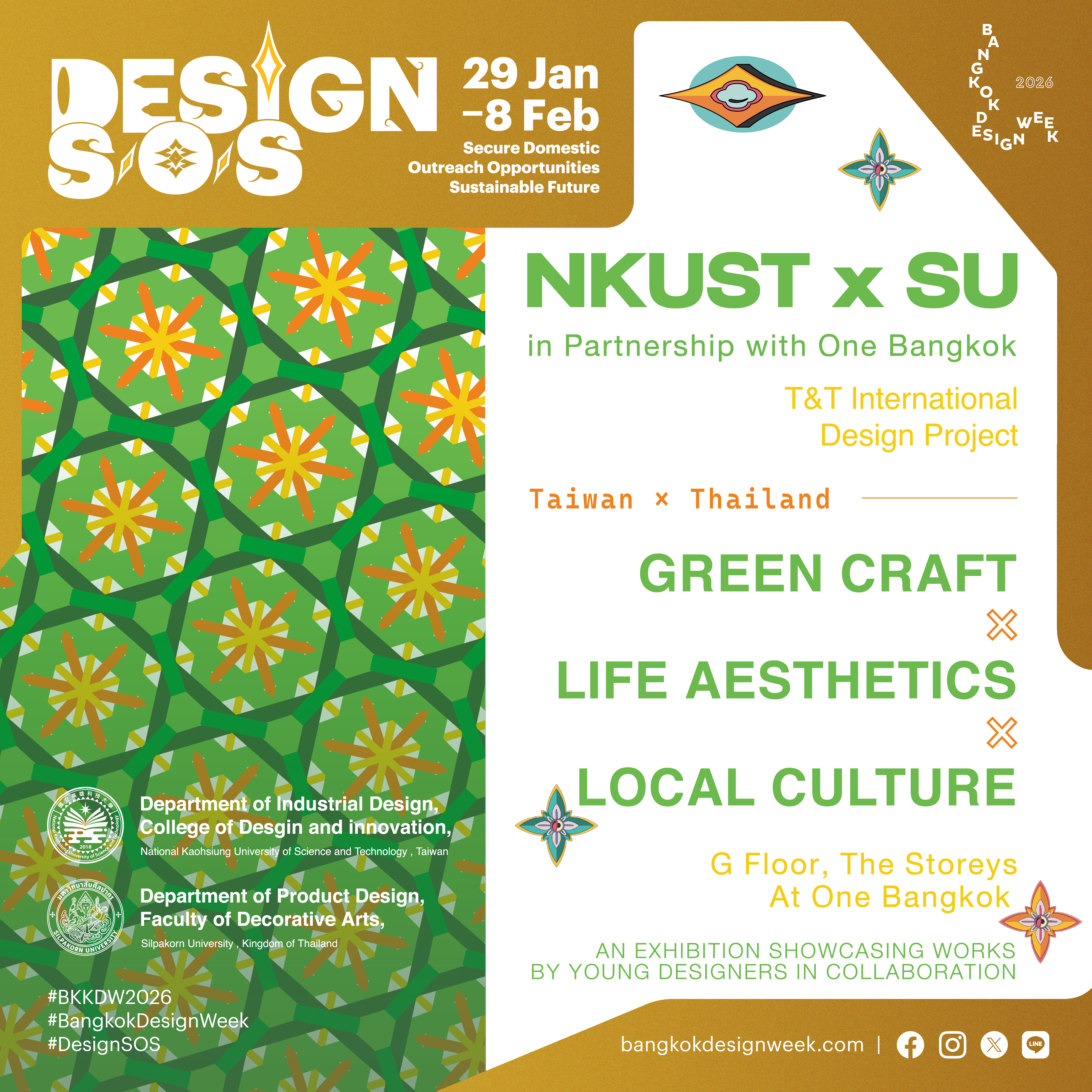 2. Student Design Exhibition: Silpakorn University & National Kaohsiung University of Science and Technology (NKUST), Taiwan An exhibition showcasing works from students of both institutions, opening a cultural dialogue between "Thai" and "Taiwanese" craftsmanship—two lands with strong artisanal roots. Under the concept “Green Craft × Life Aesthetics × Local Culture,” the exhibition focuses on selecting eco-friendly materials and production processes, reinterpreting local identity, and designing for practical use rather than just display, perfectly blending with the urban lifestyle aesthetics of today. Location: The Storeys Gallery, Zone The Storeys at One Bangkok, Floor [Floor Number]