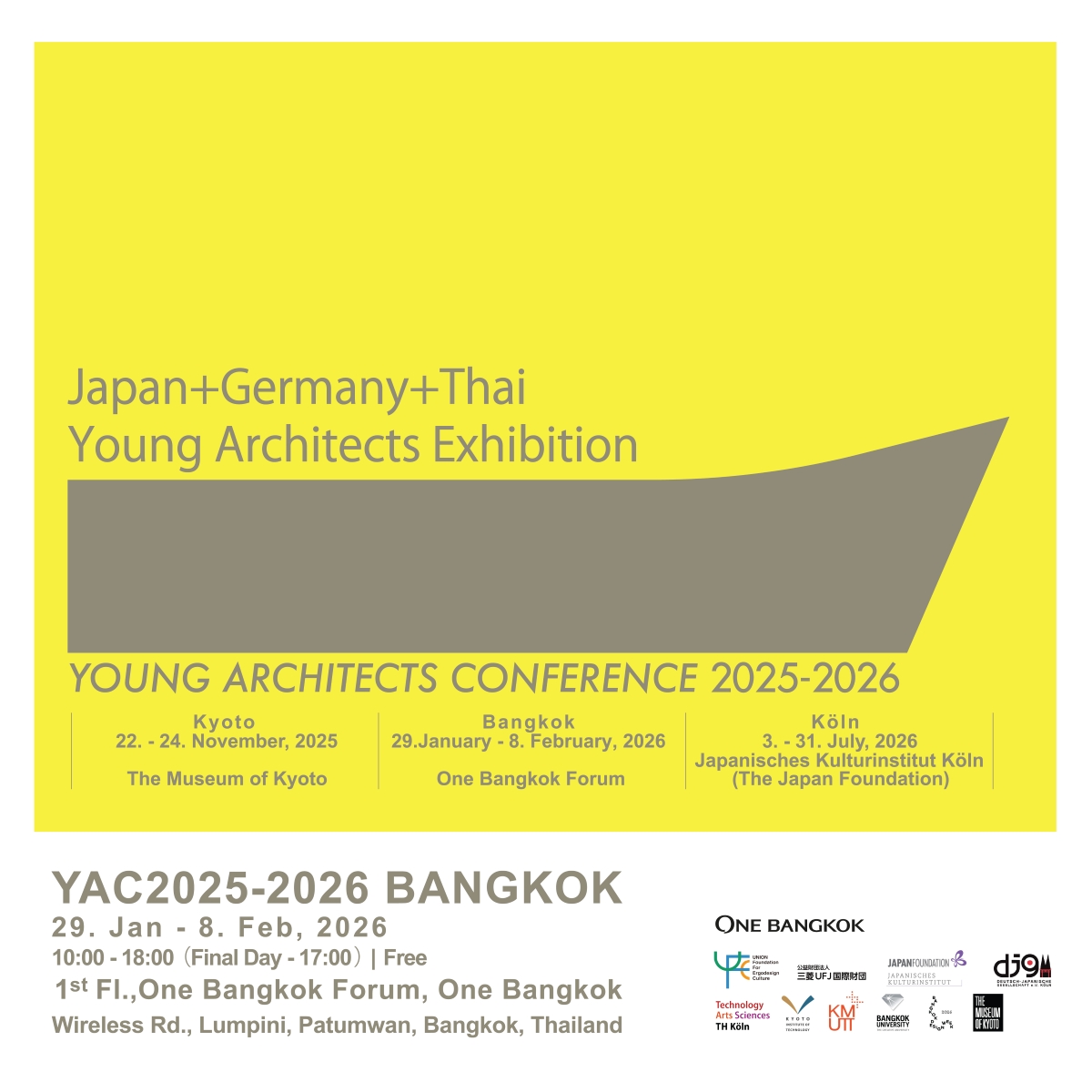 3. Young Architect Conference (YAC 2025-2026) Presenting works from 121 emerging and rising architects from Thailand, Japan, and Germany. This is a cooperation between students and architectural scholars from King Mongkut's University of Technology Thonburi (KMUTT) and Bangkok University, together with Kyoto Institute of Technology (Japan) and TH Köln (University of Applied Sciences) (Germany). The event opens new perspectives on innovation and design trends that blend local and global concepts to expand understanding of the modern era. Seminar Date: Saturday, January 31, 2026 (Featuring architects from all 3 countries) Location: 1st Floor, One Bangkok Forum.