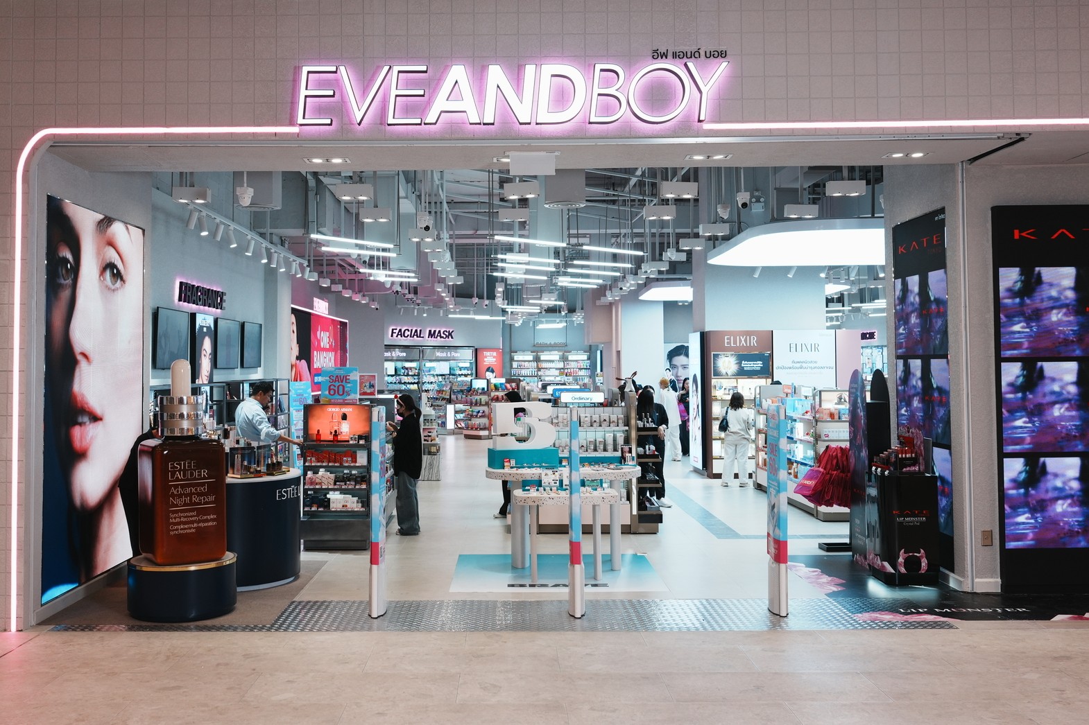 ถัดมาคือมัลติแบรนด์สโตร์สัญชาติไทยที่ครองใจสาว ๆ อย่าง EVEANDBOY ที่พร้อมเปิดประตูต้อนรับสายช้อปโดยตั้งอยู่ที่ ชั้น G โซนพาเหรด (Parade) ใน วัน แบงค็อก (One Bangkok) ด้วยพื้นที่กว้างขวางและดีไซน์ที่ทันสมัย นี่คือร้านเครื่องสำอางที่ตอบโจทย์ทุกเจเนอเรชันและทุกไลฟ์สไตล์ รวบรวมไอเทมความงามตั้งแต่หัวจรดเท้า ไม่ว่าจะเป็นเมคอัพ สกินแคร์ น้ำหอม หรืออุปกรณ์ดูแลเส้นผม
