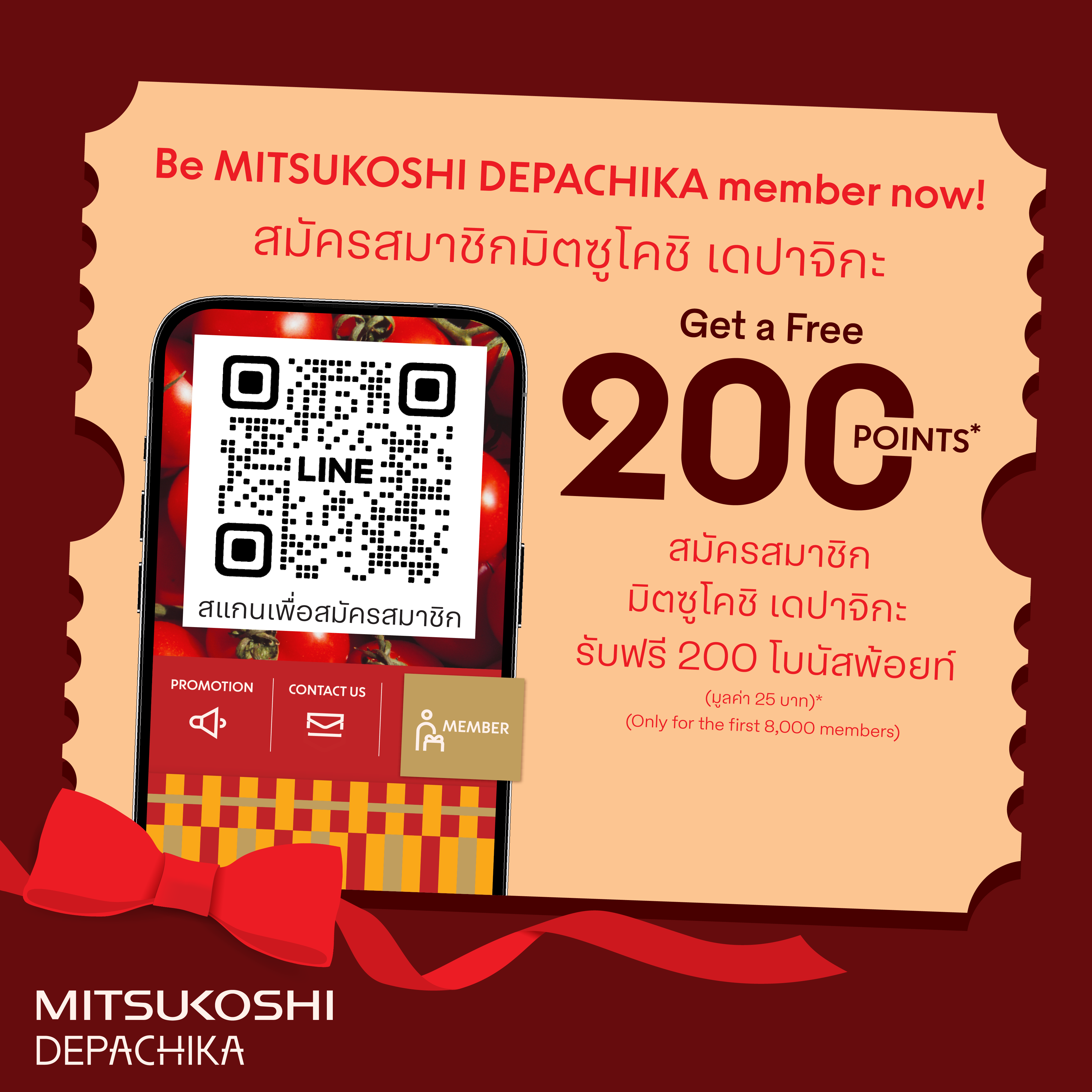 - สอบถามข้อมูลเพิ่มเติมเกี่ยวกับโปรโมชั่นหรือการสะสมและแลกคะแนน สามารถติดต่อได้ที่ LINE "MITSUKOSHI DEPACHIKA TH"