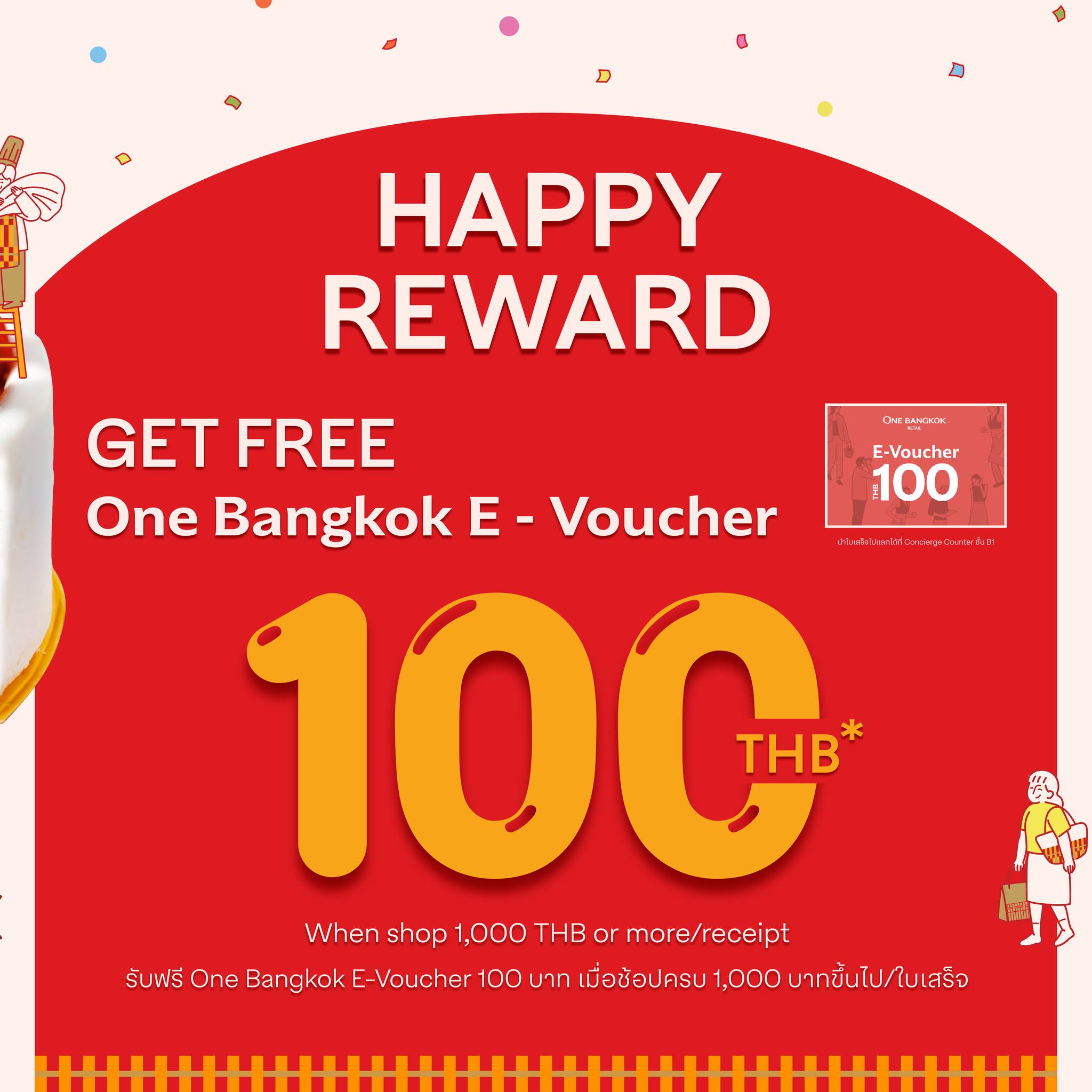 - สามารถนำใบเสร็จไปแลกรับ One Bangkok E-Voucher มูลค่า 100 บาท ได้ที่จุด Concierge Counter ชั้น B1 โดยแบ่งการแจกเป็น 2 รอบ