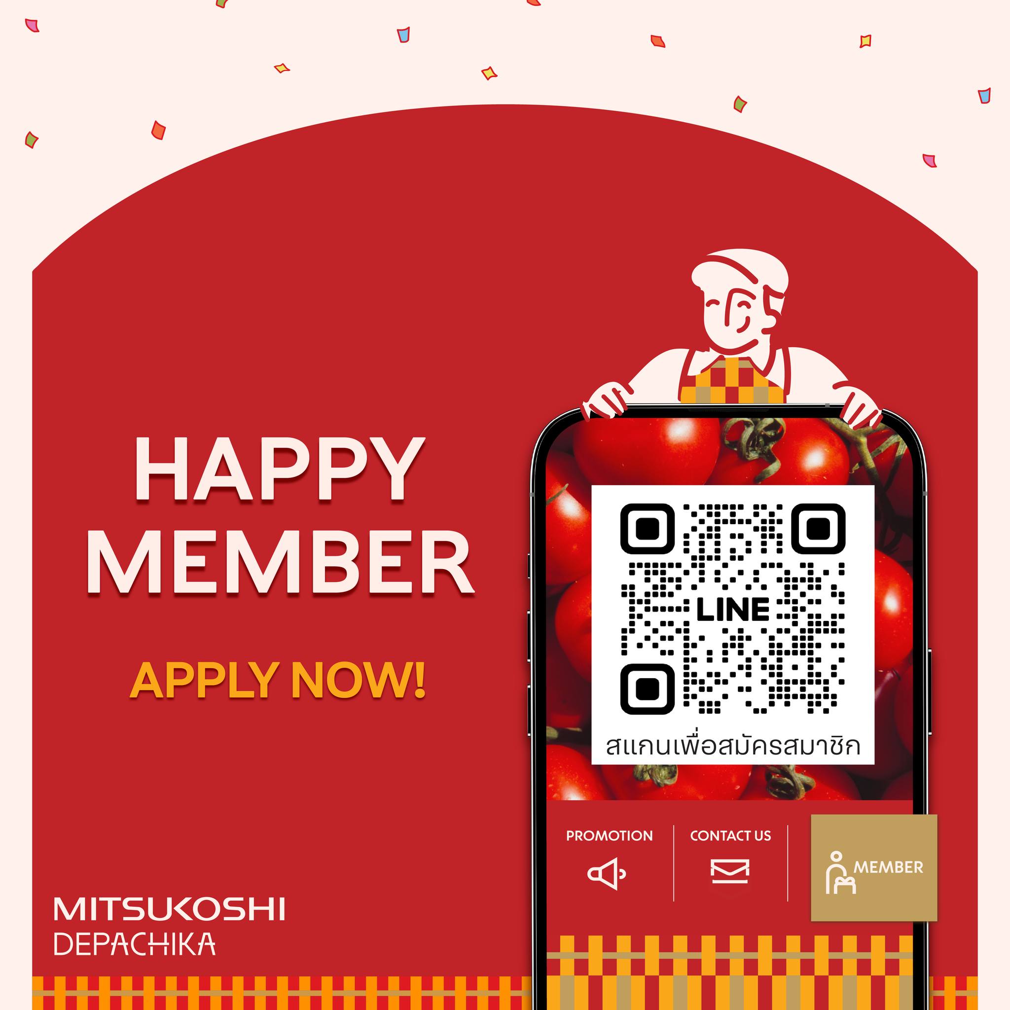 - สอบถามข้อมูลเพิ่มเติมเกี่ยวกับโปรโมชั่นหรือการสะสมและแลกคะแนน สามารถติดต่อได้ที่ LINE "MITSUKOSHI DEPACHIKA TH"