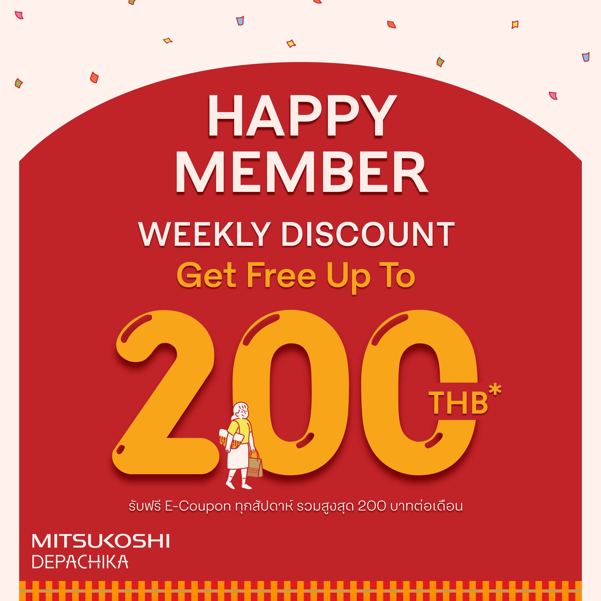 - สมาชิก มิตซูโคชิ เดปาจิกะ รับ Weekly Discount สูงสุด 200 บาท/เดือน*