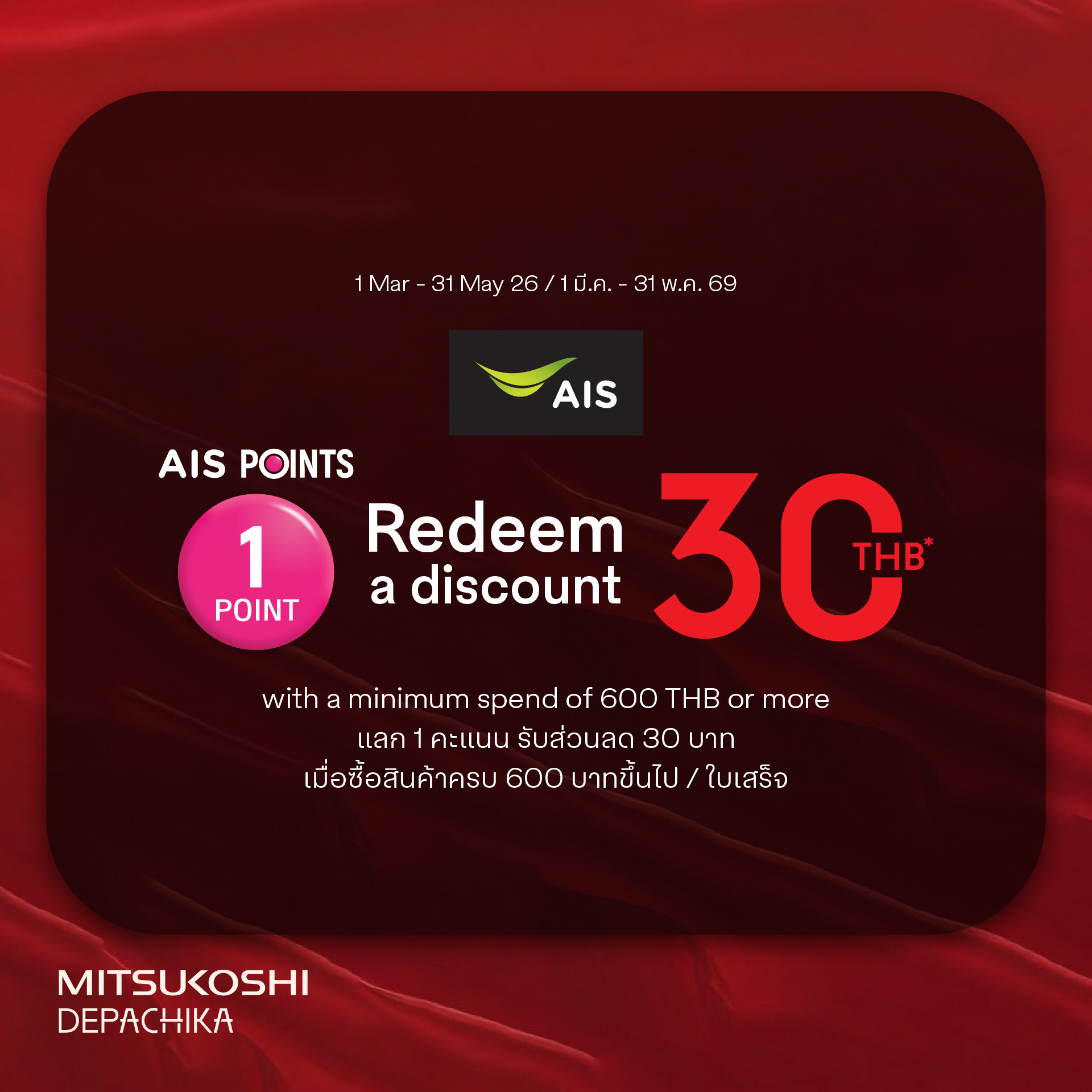 ลูกค้าเอไอเอส ใช้ 1 คะแนน แลกรับส่วนลด 30 บาท เมื่อซื้อสินค้าครบ 600 บาทขึ้นไป/ใบเสร็จ