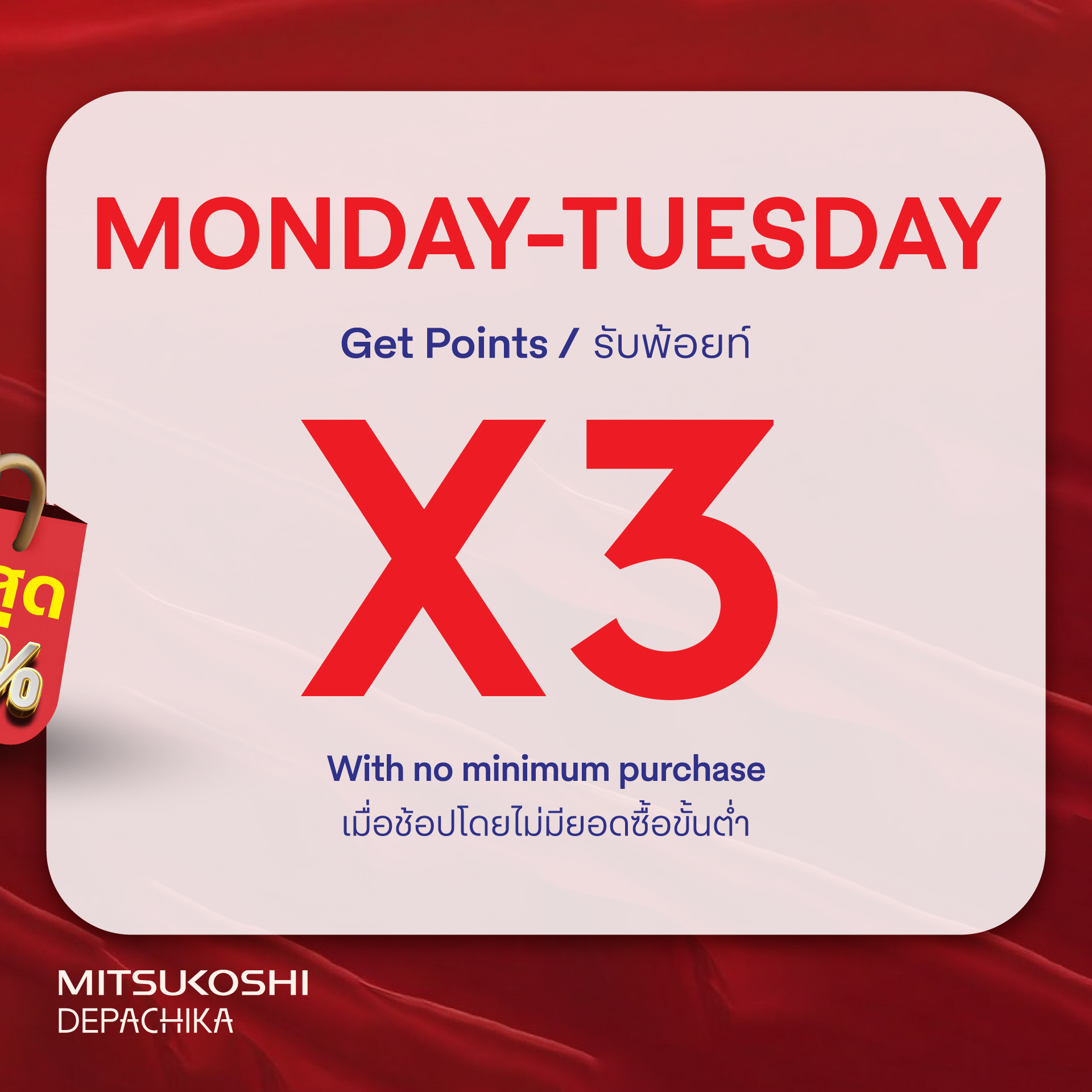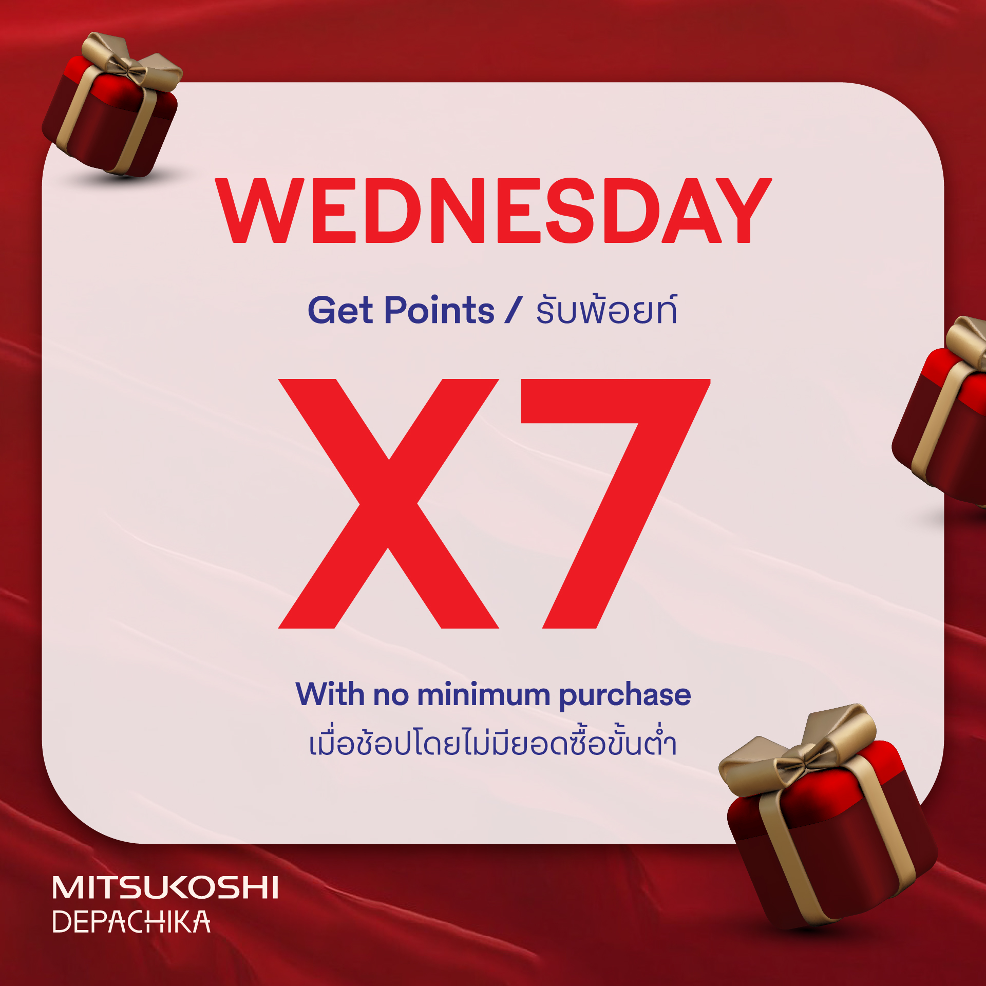 - คะแนนพิเศษจะเข้าบัญชีท่านในวันถัดไปนับจากวันที่ซื้อ โดยสามารถตรวจสอบคะแนนสะสมได้ใน Line "MITSUKOSHI DEPACHIKA TH"